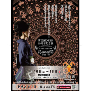 店舗を新築リニューアルしてから、おかげさまで10周年を迎えました。2026樹華屋新作きもの展を記念催事として開催いたします。どうぞお楽しみに!