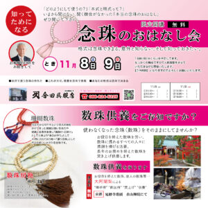 今回関西より数珠の巨匠をお招きして【念珠のおはなし会】を開催いたします。今更人に聞けない【大切な・・・】おはなし。 「どうやって使うの?」「本式と略式って?」 知っているようで知らないことは沢山あります。これからの人生の […]